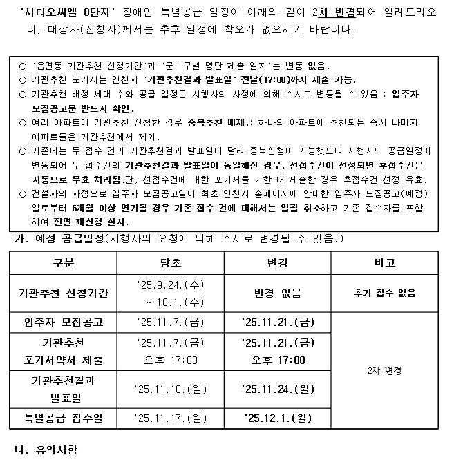 (변경) '시티오씨엘 8단지' 장애인 특별공급 일정 2차 변경 알림