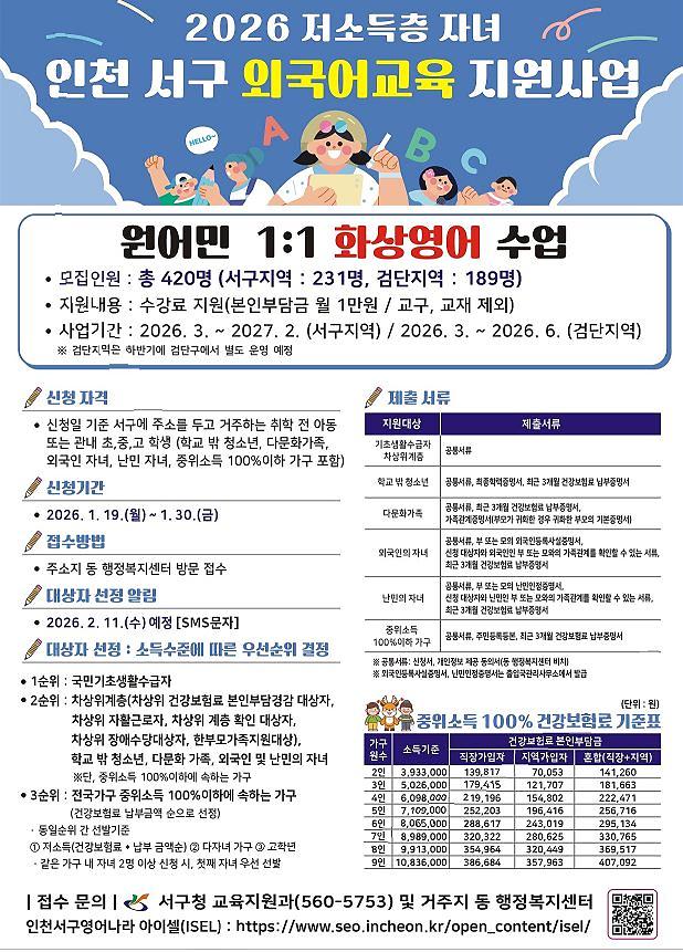 2026년 저소득층 자녀 외국어 교육 지원사업 정원 미달 프로그램의 선착순 추가 신청받습니다.
