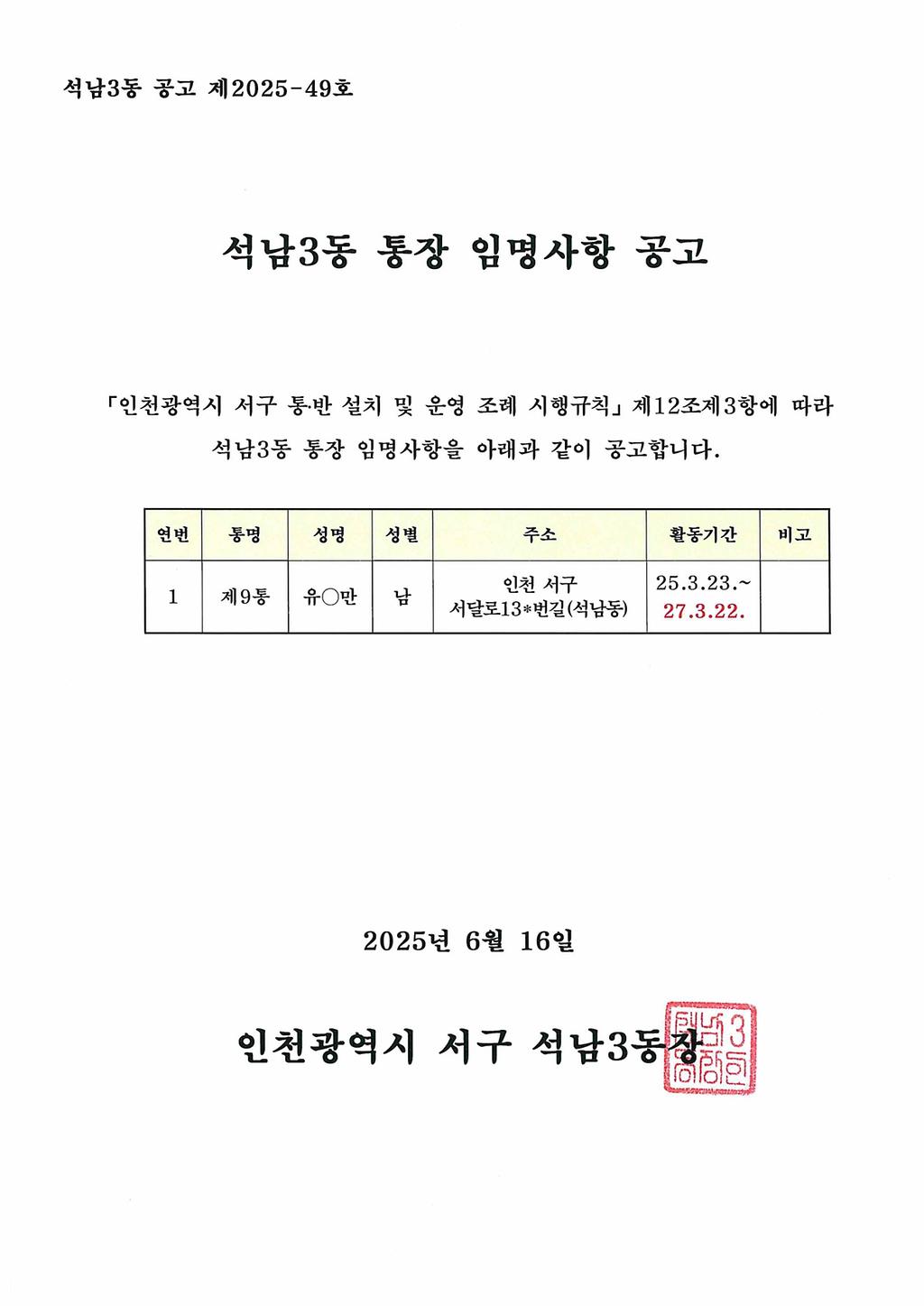 (수정) 석남3동 통장 임명사항 공고(제9통장)