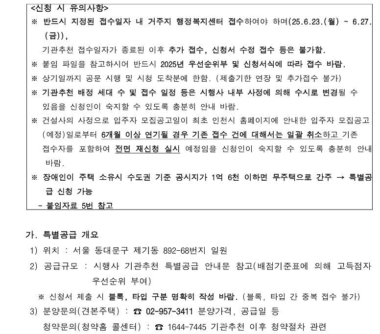 (민간분양)장애인특별공급 기관추천 대상자 명단 접수안내(동대문 제기동역 아이파크)