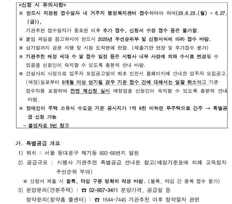 (민간분양)장애인특별공급 기관추천 대상자 명단 접수안내(동대문 제기동역 아이파크)