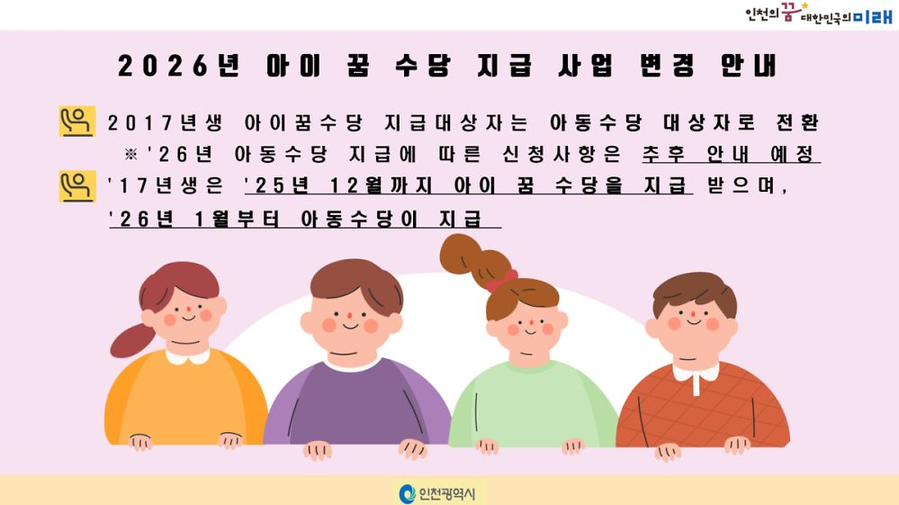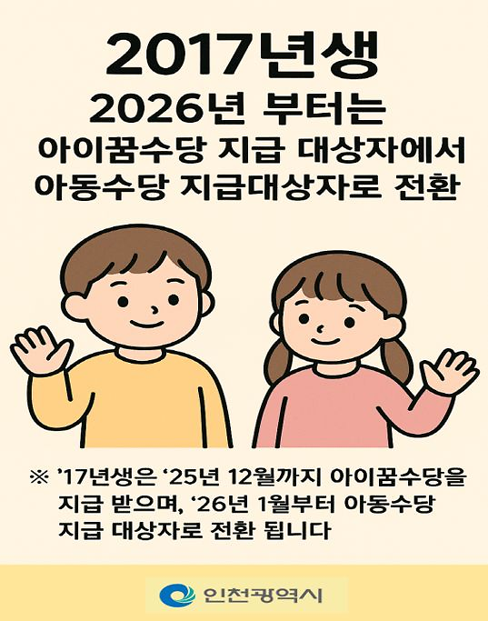 - 아이 꿈 수당은 아동수당 중지 대상자에게 지급하고 있는 사업으로, 2026년 아동수당 지급 대상자확대로 0~9세미만(’26년생~‘17년생)으로 확대되어, ’17년생은 ‘25년 12월까지 아이꿈수당을 지급 받으며, ’26년 1월부터 아동수당을 지급 받게 됩니다.