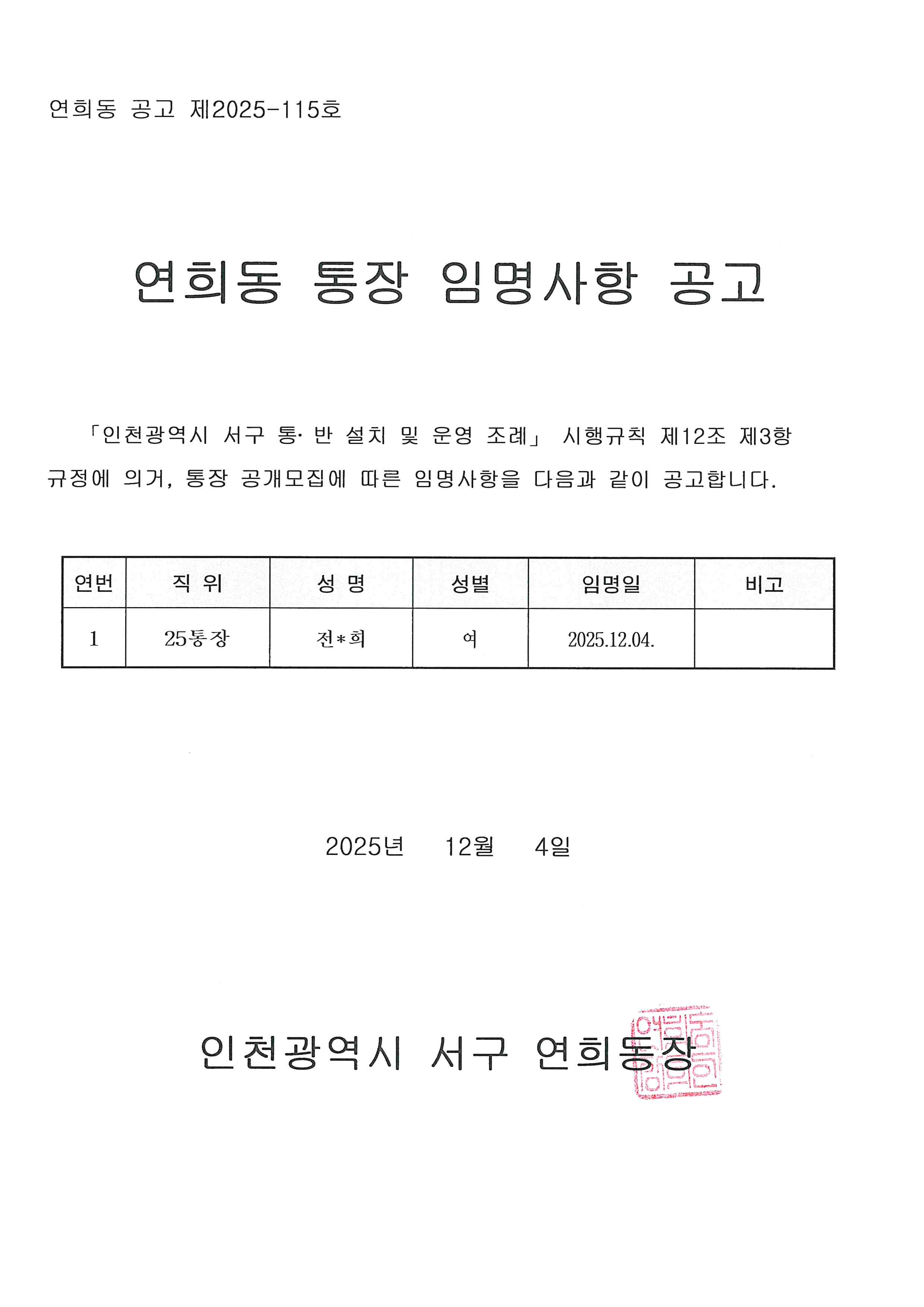 연희동 제25통장 임명사항 공고