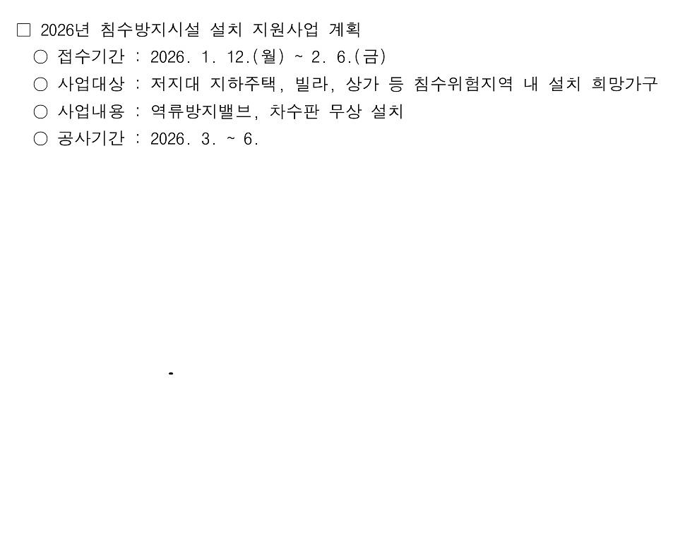 2026년 침수방지시설 설치 지원사업을 붙임과 같이 안내드립니다.