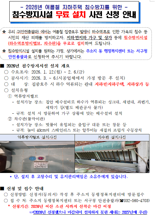 2026년 침수방지시설 설치 지원사업 신청 안내(지하 및 반지하빌라등)