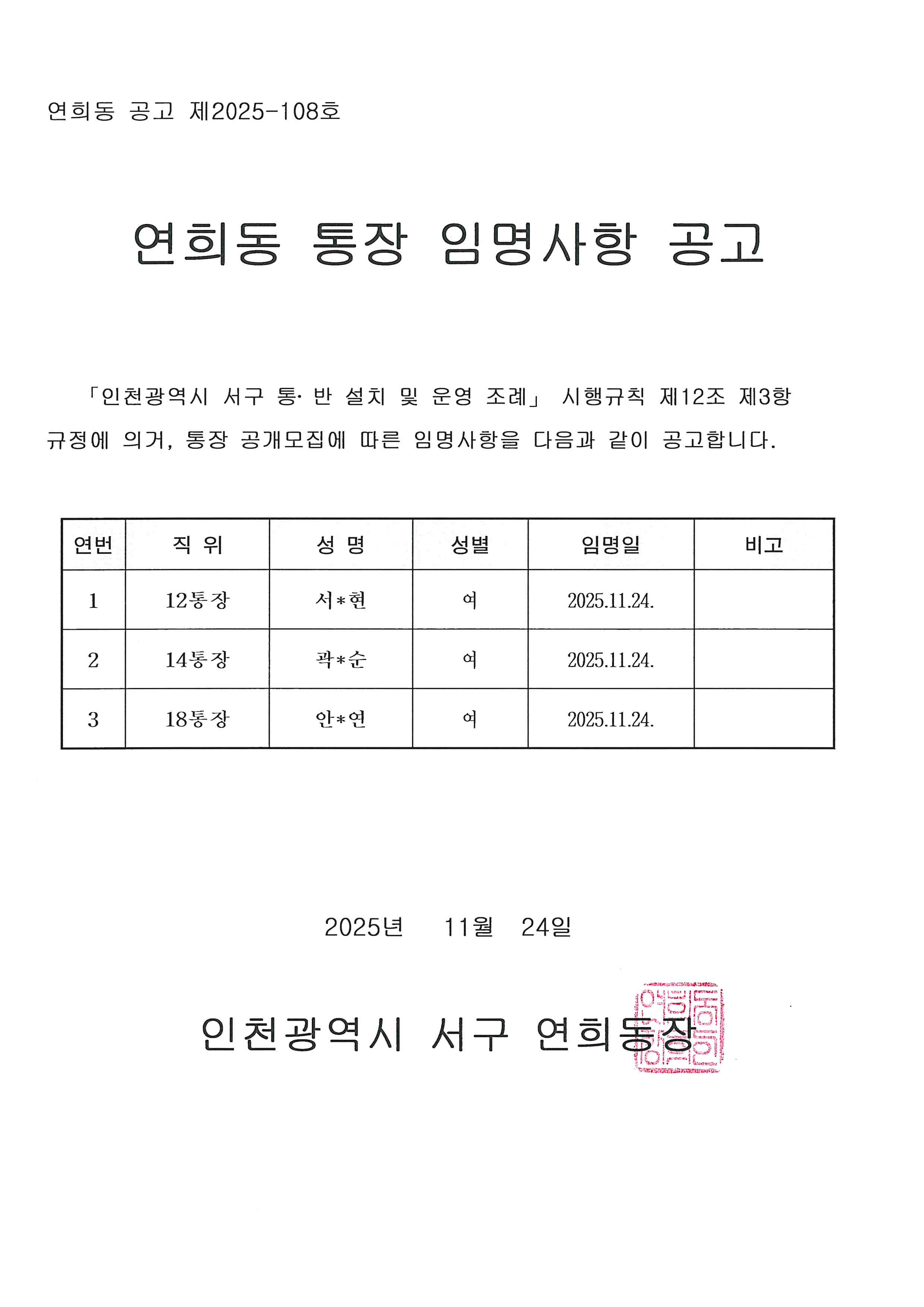 연희동 통장 임명사항 공고(제12통, 14통, 18통)