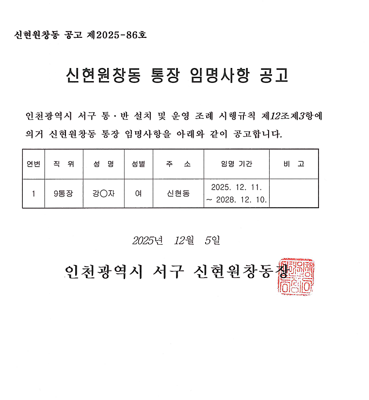 신현원창동 통장 임명사항 공고(제9통)