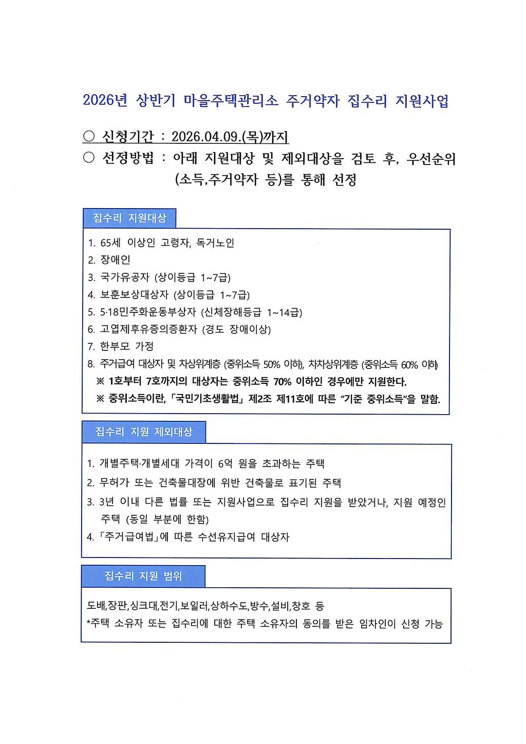 2026년 상반기 마을주택관리소 주거약자 집수리 지원