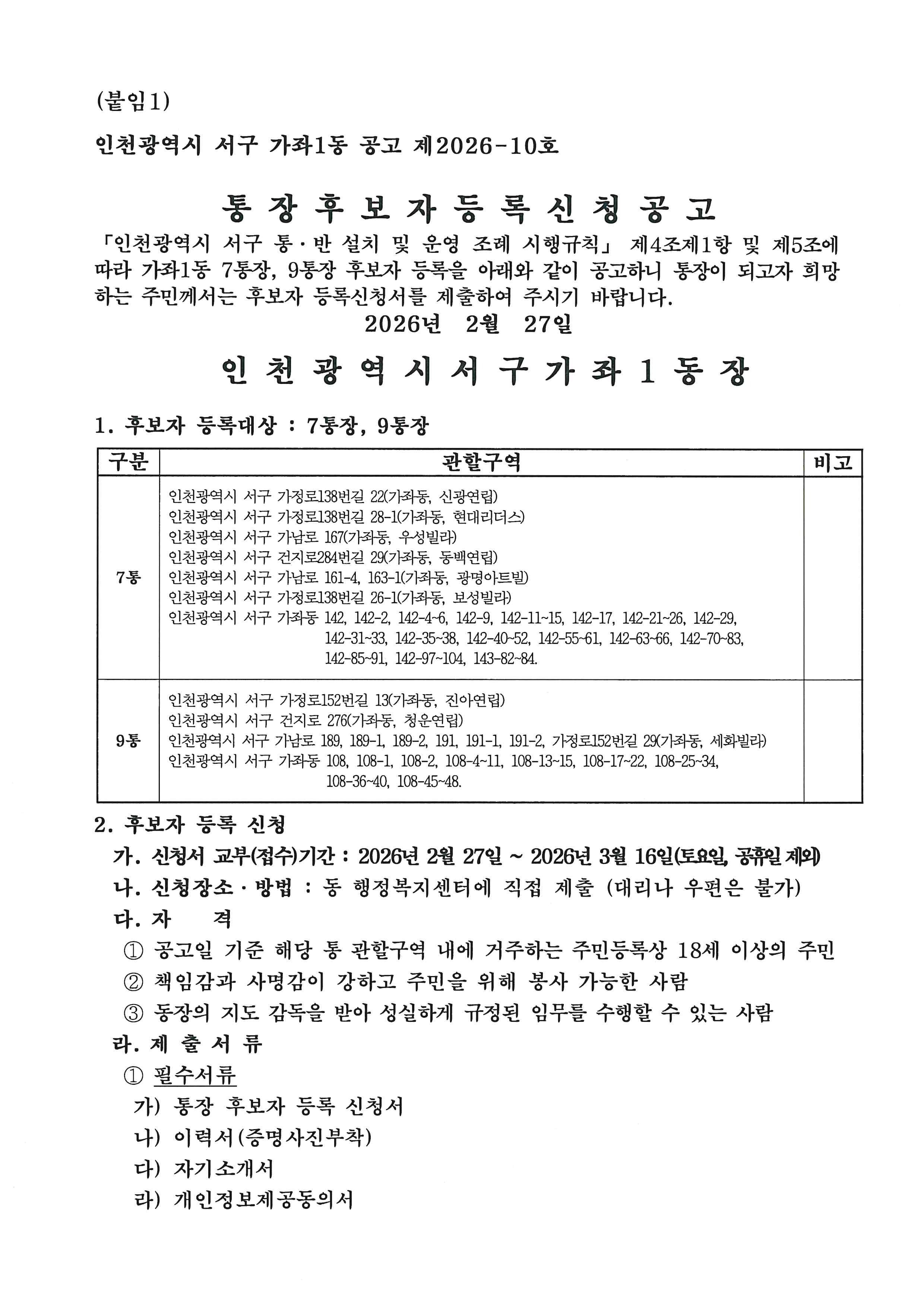 『인천광역시 서구 통·반 설치 및 운영 조례 시행규칙』 제4조제1항 및 제5조에 따라 가좌1동 제7통, 9통 통장 공개모집을 아래와 같이 공고합니다.