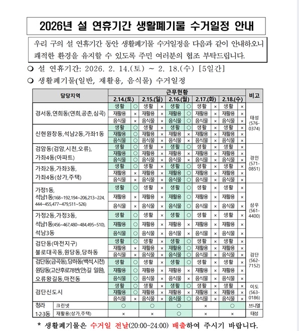 2026년 설 연휴 생활폐기물 수거일정을 알려드립니다.