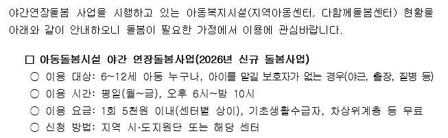 2026년 아동돌봄시설 야간 연장돌봄사업 안내