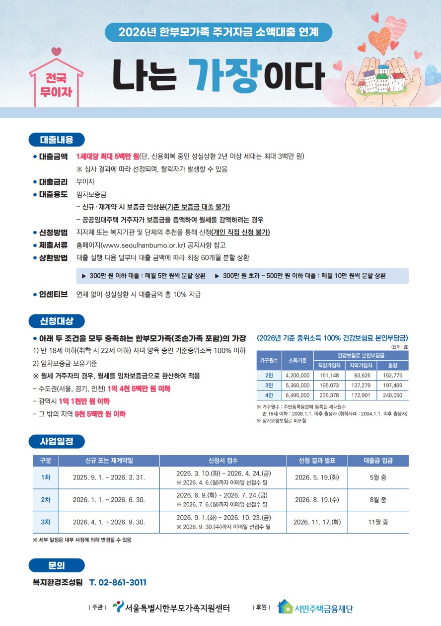 2026년 1차 한부모가족 주거자금 소액대출연계 '나는 가장이다' 신청 안내