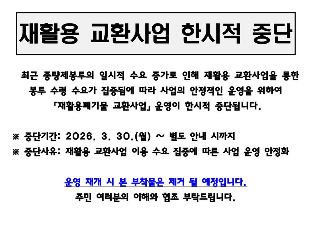 사업의 안정적인 운영을 위하여 「재활용폐기물 교환사업」운영이 한시적 중단됩니다.