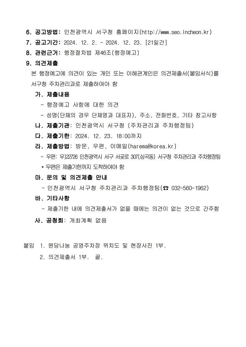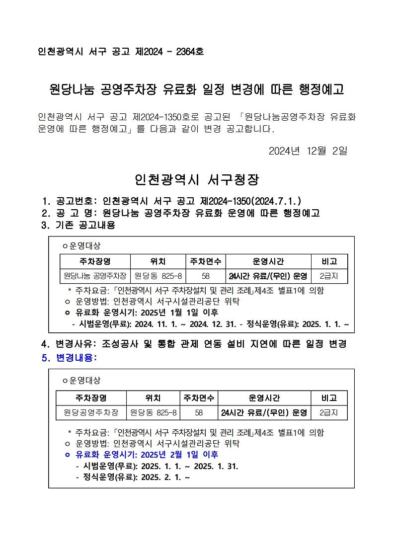 원당나눔 공영주차장 유료화 일정 변경에 따른 행정예고