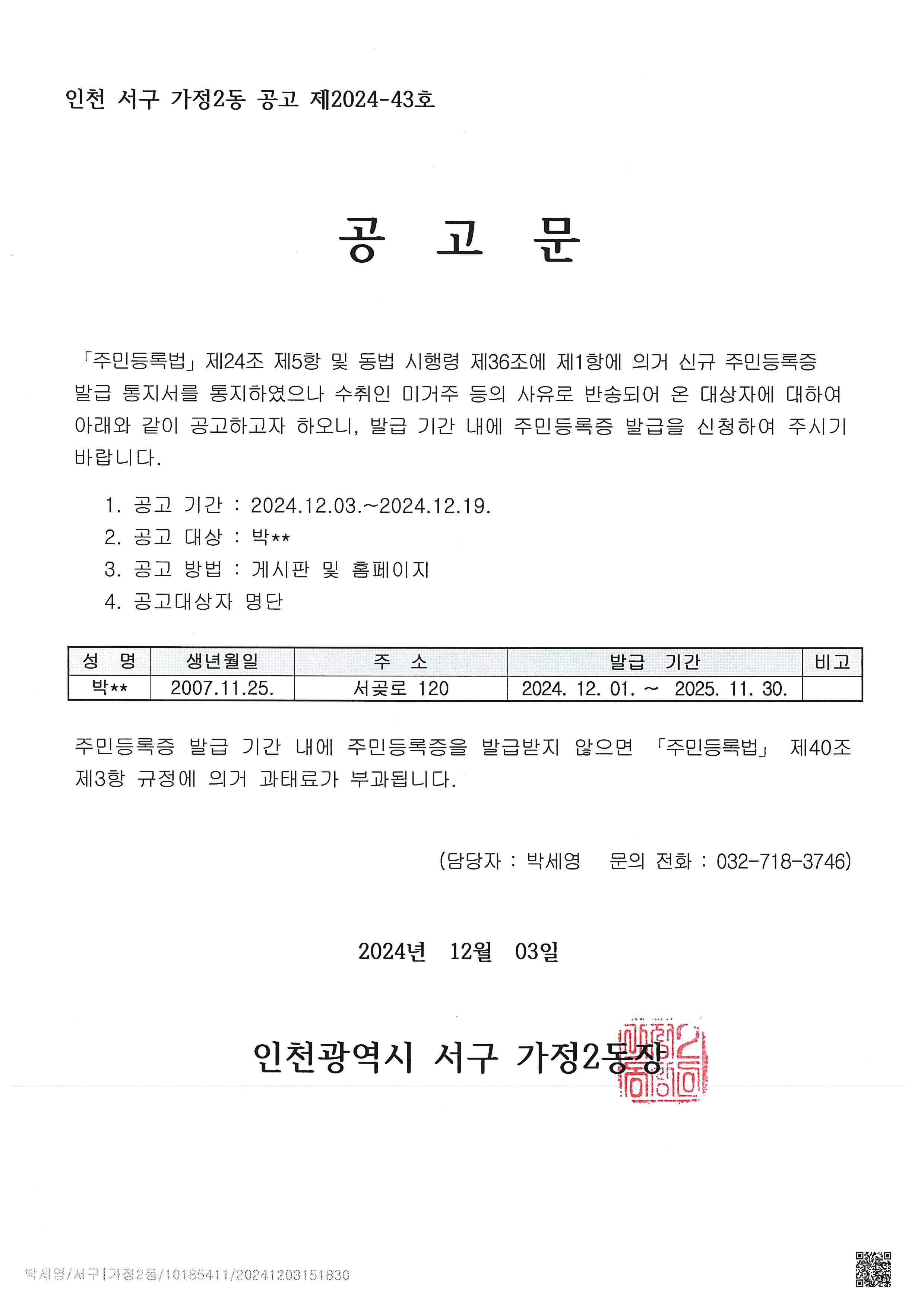 신규주민등록증 발급 통지서 반송에 따른 공고(2007년 11월생)