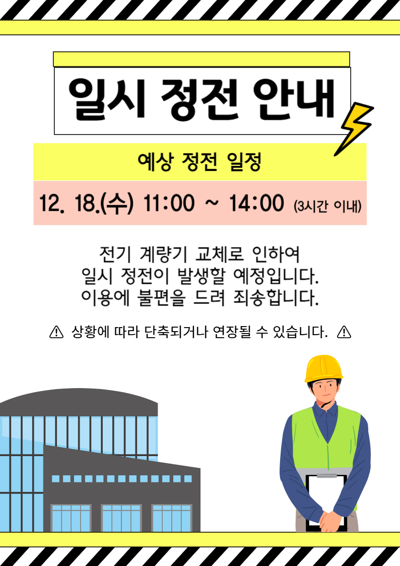 ○ 정전 일정: 2024.12.18.(수) 11:00 ~ 14:00 (3시간 이내 예정)