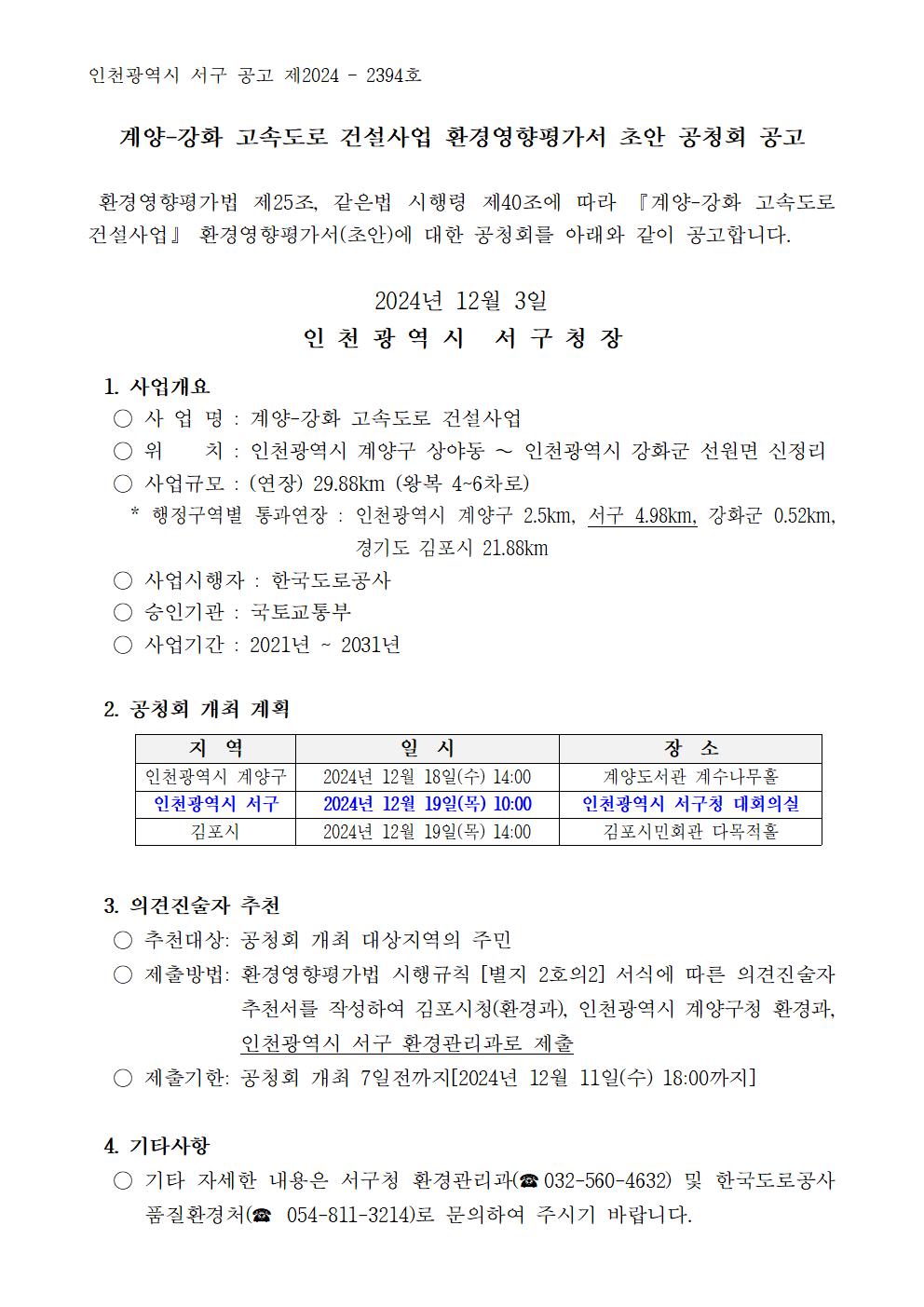 「계양-강화 고속도로 건설사업」 환경영향평가서(초안) 공청회 개최 안내