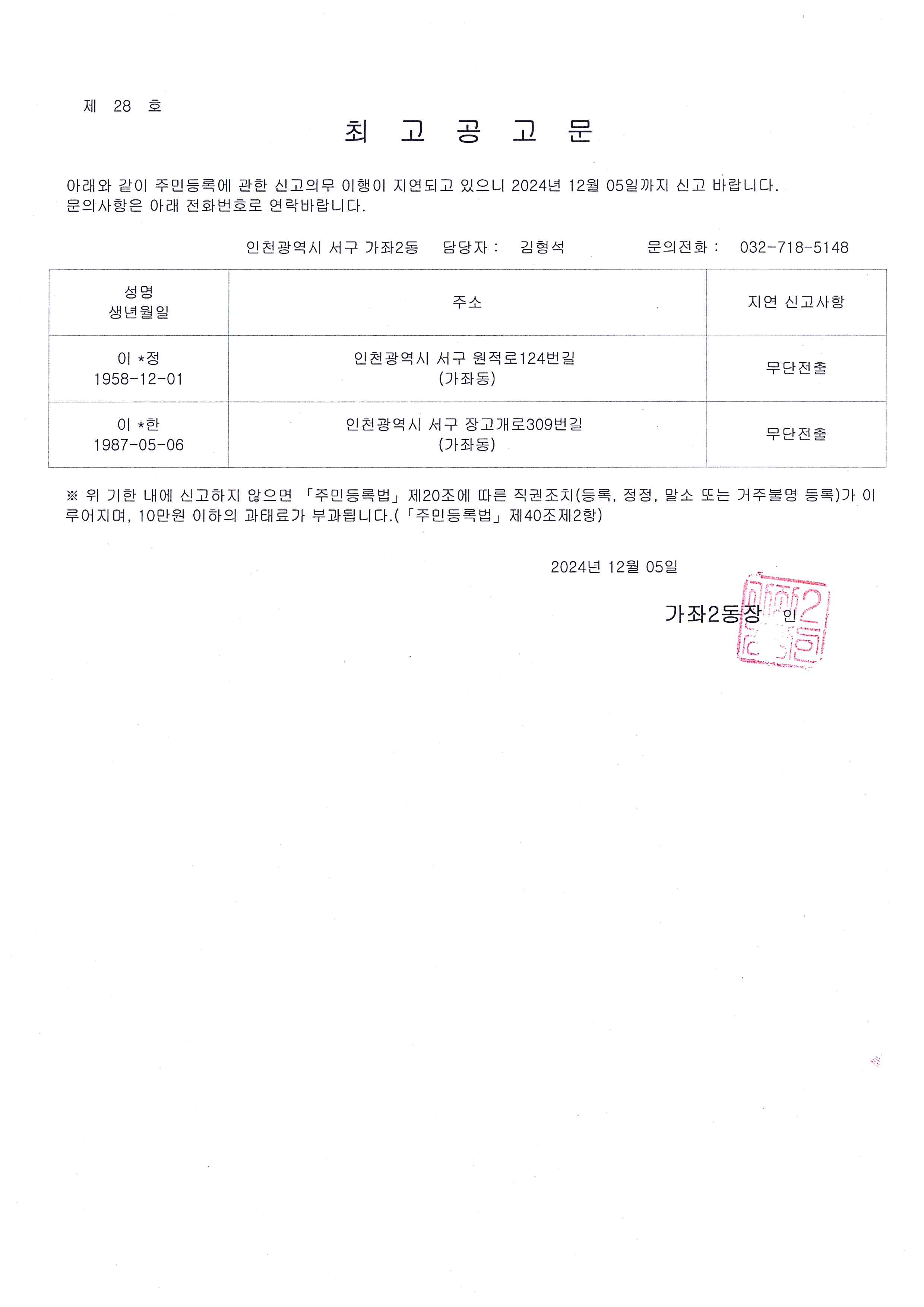 주민등록법 제20조 제3항의 규정에 의거 주민등록 무단전출자에 대하여 최고 하였으나, 수취인 부재 등의 사유로 반송되어 동법 시행령 제28조 규정에 의거 붙임과 같이 공고합니다.