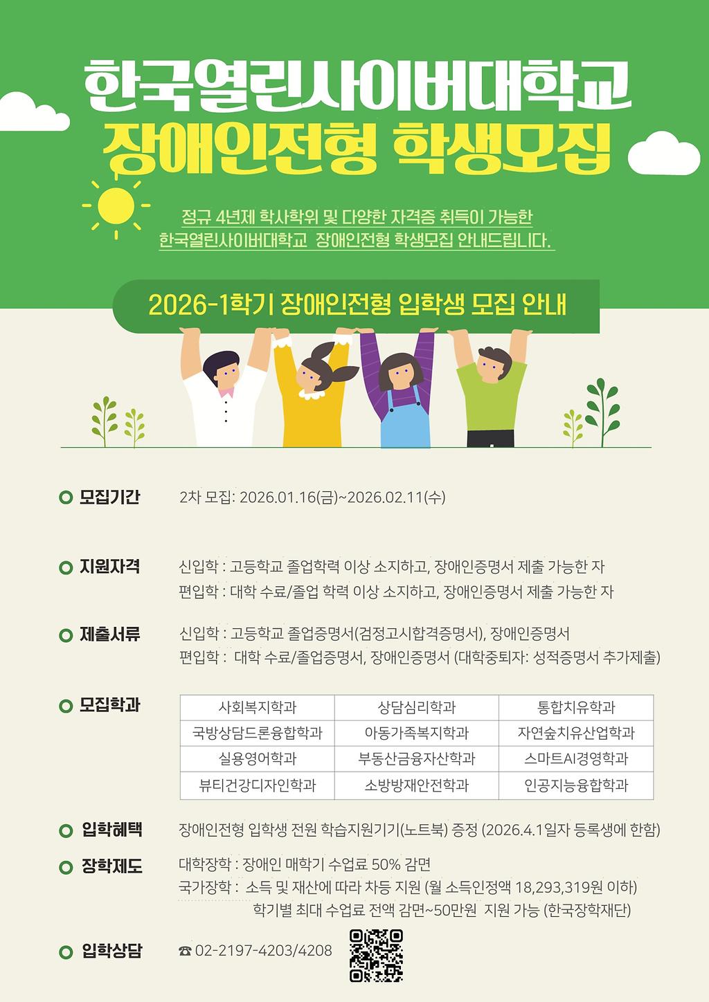 [한국열린사이버대학교] 26-1학기 2차 장애인전형 모집 및 혜택안내