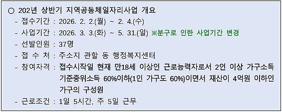 「2026년 상반기 지역공동체일자리사업」 참여자 모집을 붙임과 같이 공고합니다.
