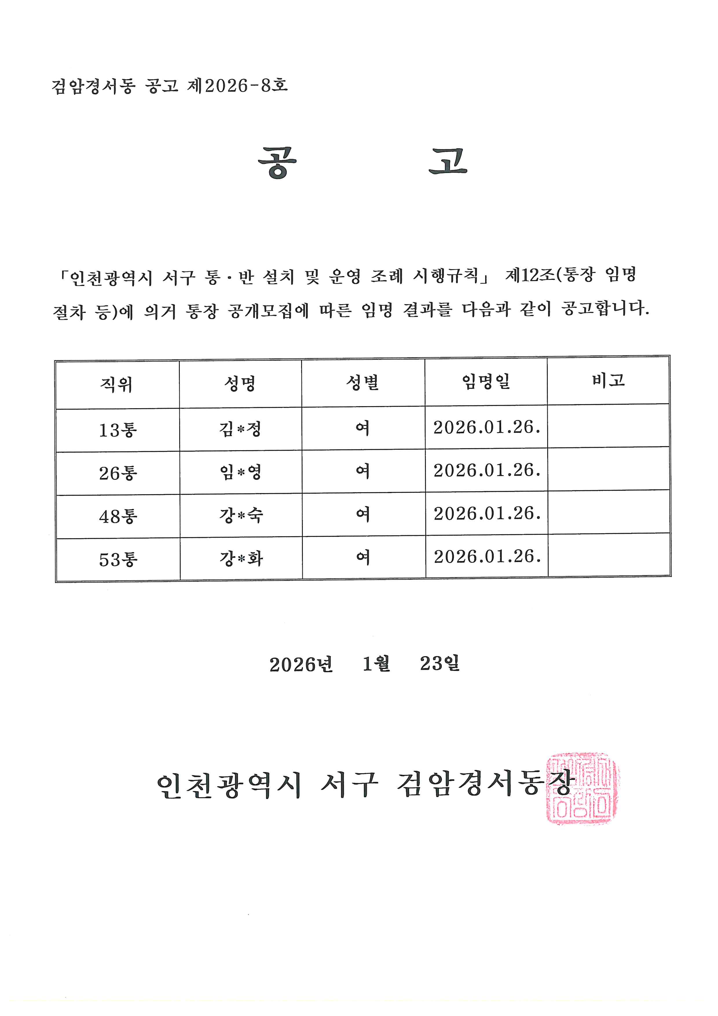 검암경서동 통장임명사항 공고(13,26,48,53통)