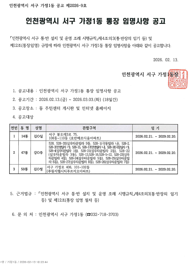 가정1동 통장 임명사항 공고(제14,47,50통)