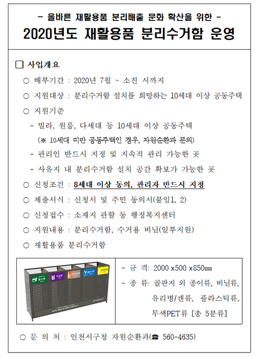「2020년도 재활용품 분리수거함 운영」에 따른 신청 안내