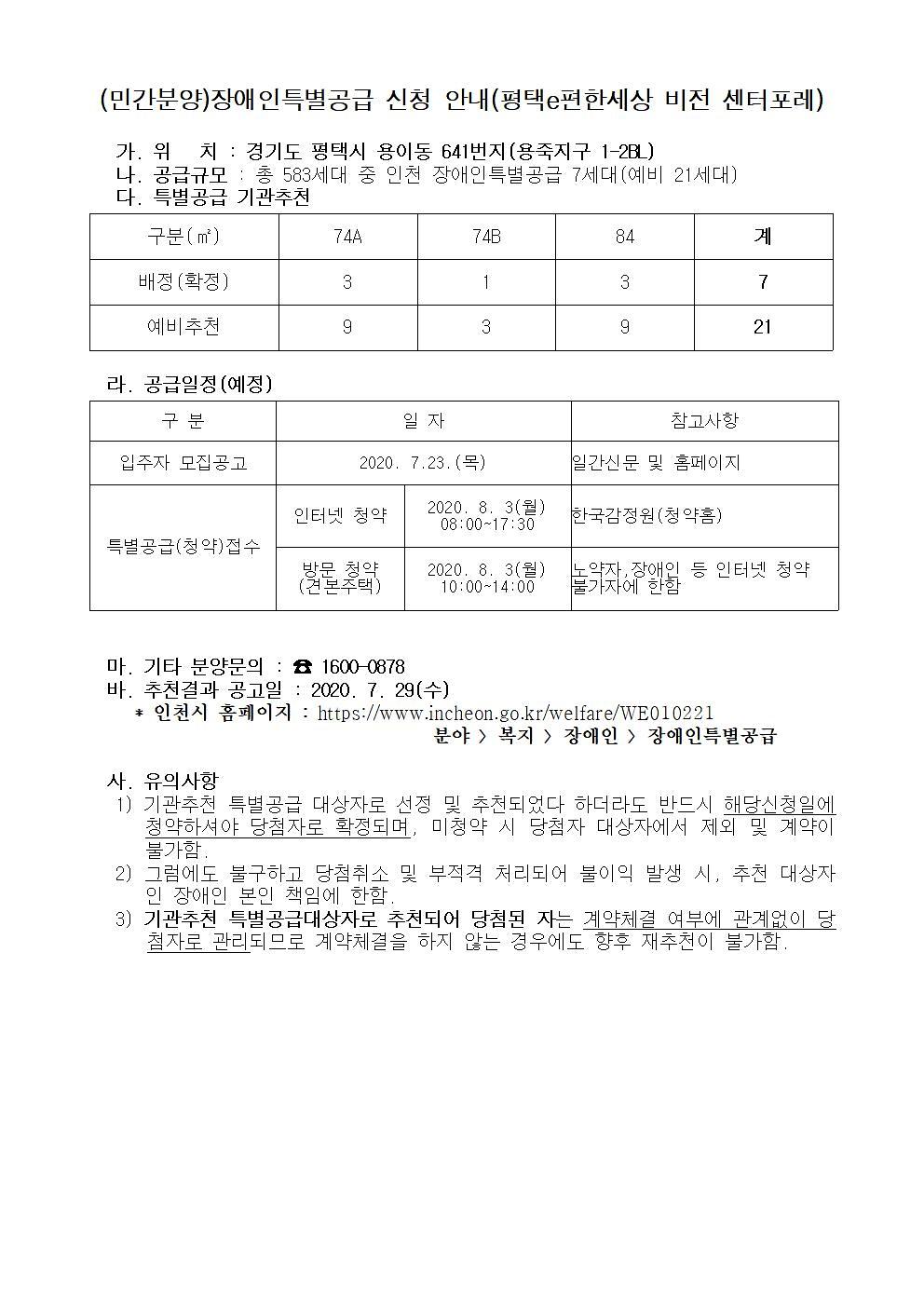 (민간분양)장애인특별공급 신청 안내(평택e편한세상 비전 센터포레)