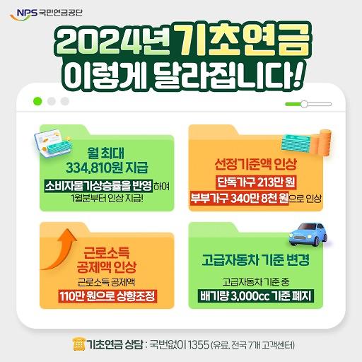 2024년 기초연금 선정기준액 : 단독 2,130,000원 / 부부 3,408,000원