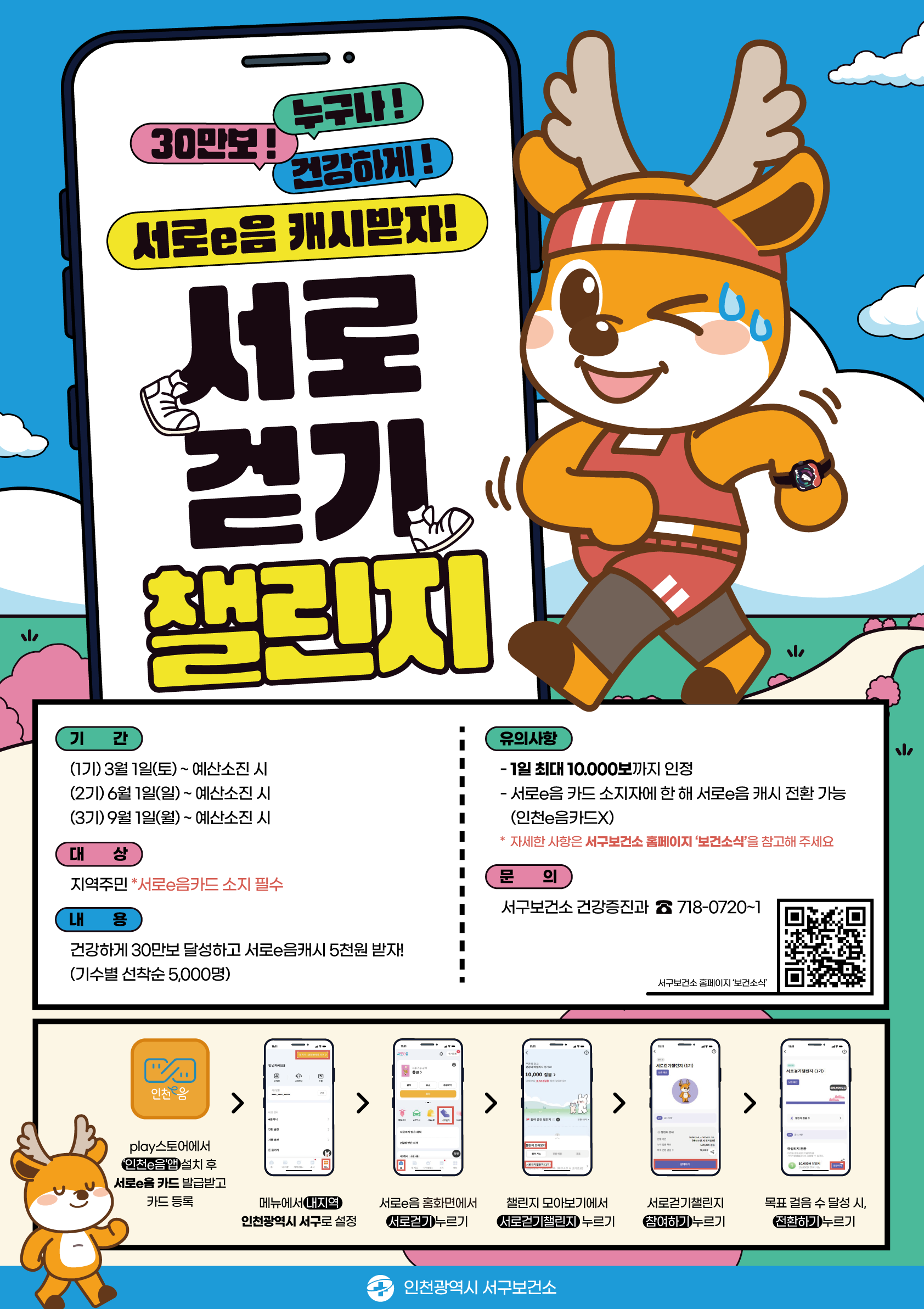 ①[인천e음]앱 설치→[내지역: 인천 서구] ※ 모든 권한 허용 필수 ②하단의 QR코드 스캔 후 [참여하기] ②30만보 달성 후 [전환하기]