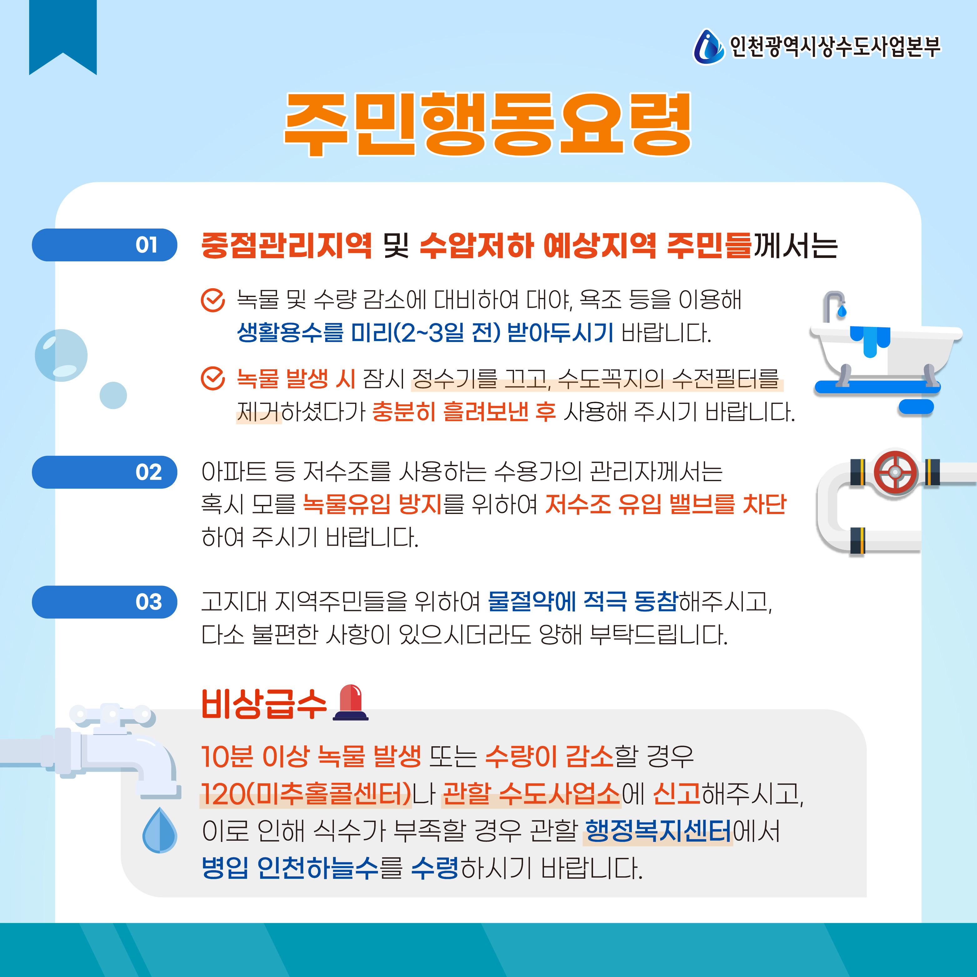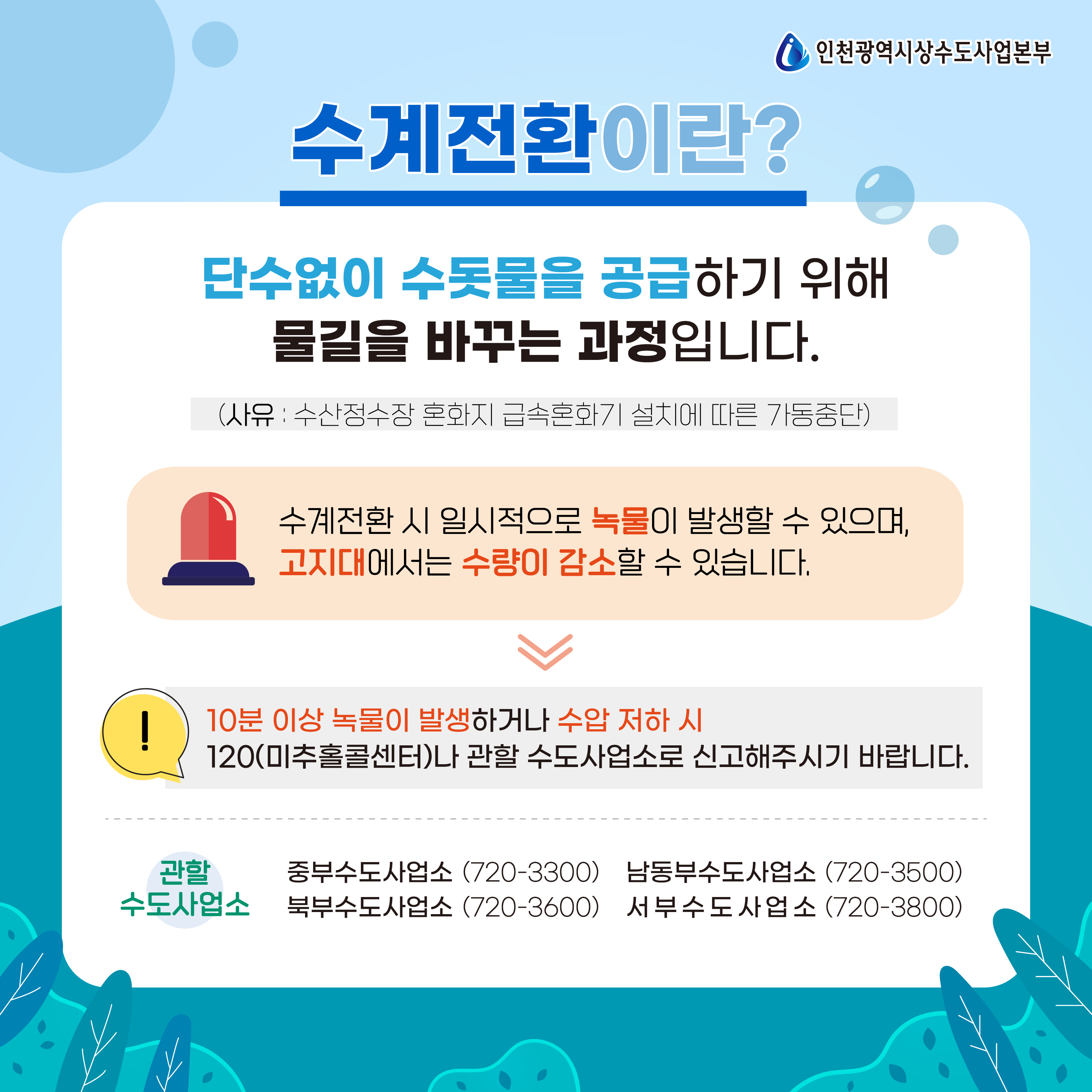 ※ 수계전환 시 녹물 발생 또는 수압이 저하될 수 있으며, 10분 이상 지속되는 경우 미추홀콜센터(120)으로 신고하여 주시기 바랍니다.