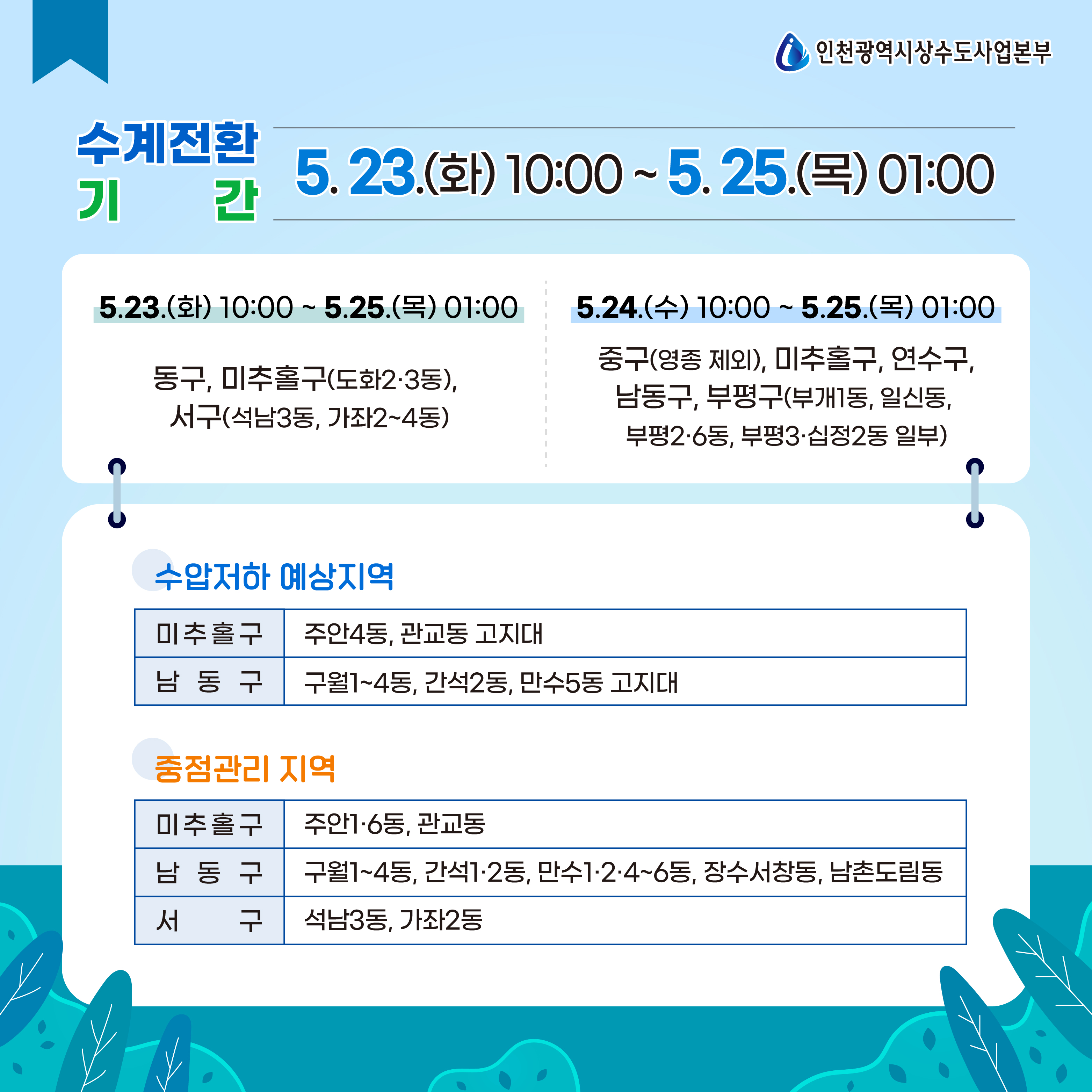 - 5.23.(화) 10:00 ~ 5.25.(목) 01:00 : 동구, 미추홀구(도화2,3동), 서구(석남3동, 가좌2~4동)