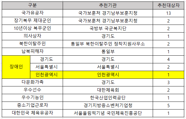 ※ 장애인 기관추천 특별공급 관련 개선사항(2022.1.3.시행) :무주택 세대구성원 기간 및 인천시 연속 거주기간 등 자격요건 판단 기준일을 접수 당일로 통일