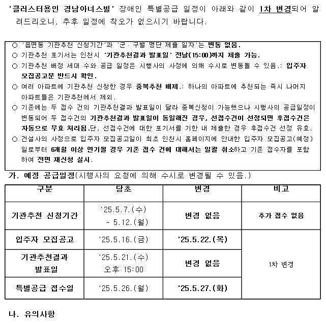 (변경) '클러스터용인 경남아너스빌' 장애인 특별공급 1차 일정변경 알림