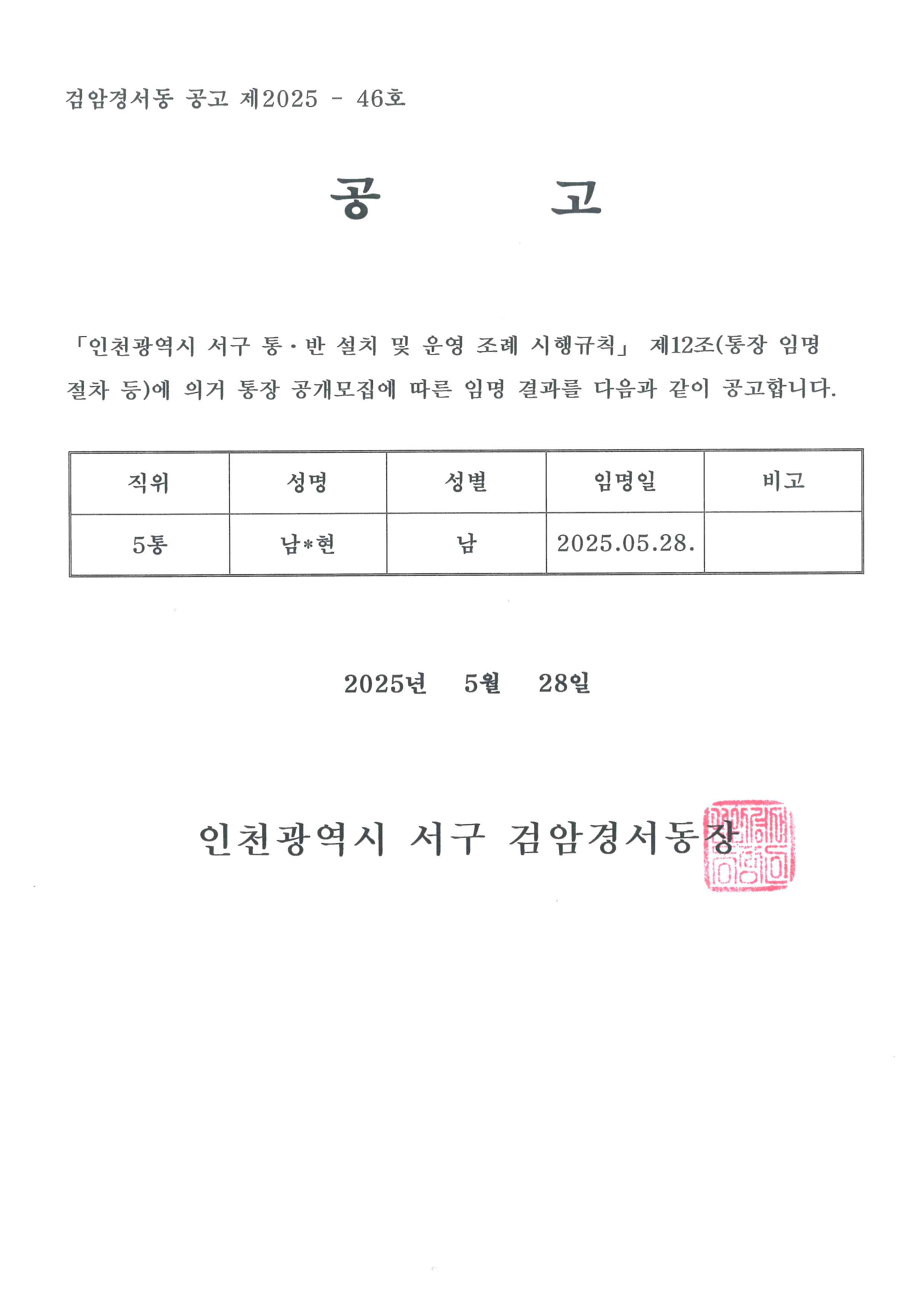 검암경서동 통장임명사항 공고(5통)