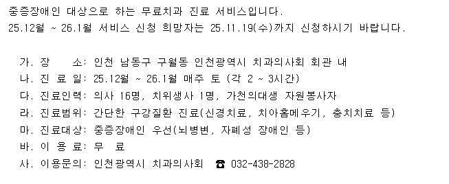 2025년 12월, 2026년 1월 장애인 무료치과 진료서비스 신청 안내