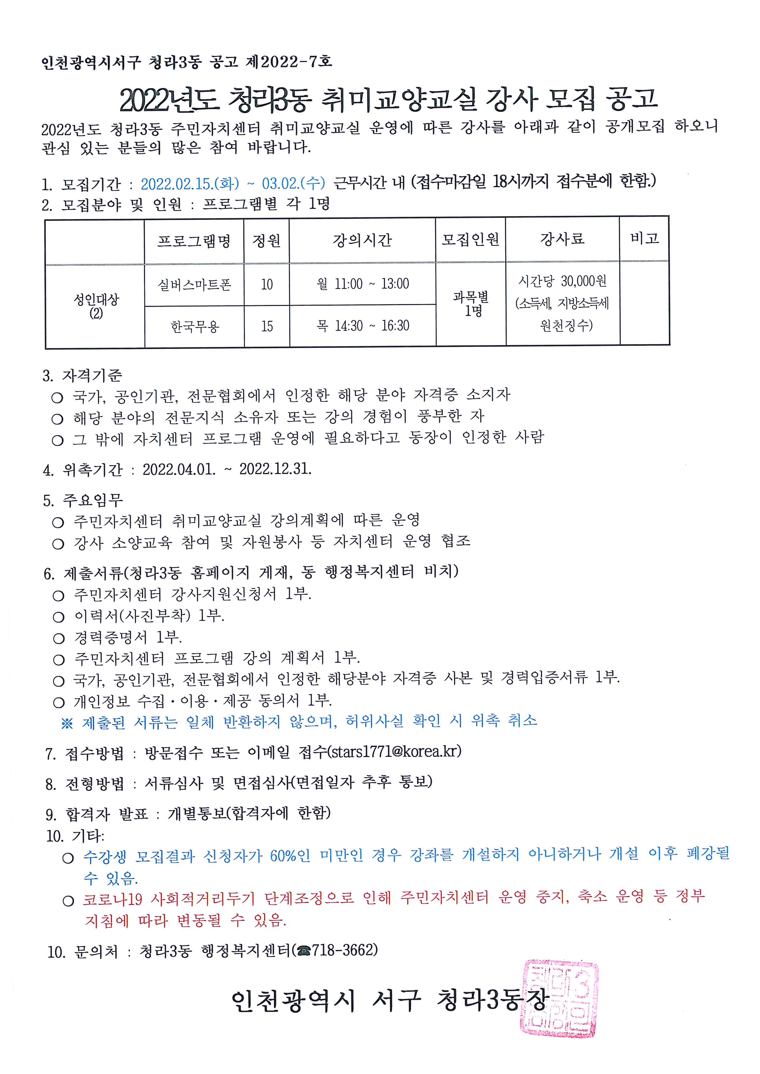 2022년도 청라3동 주민자치센터 취미교양교실 강사 모집을 아래와 같이 공고하고자 합니다.