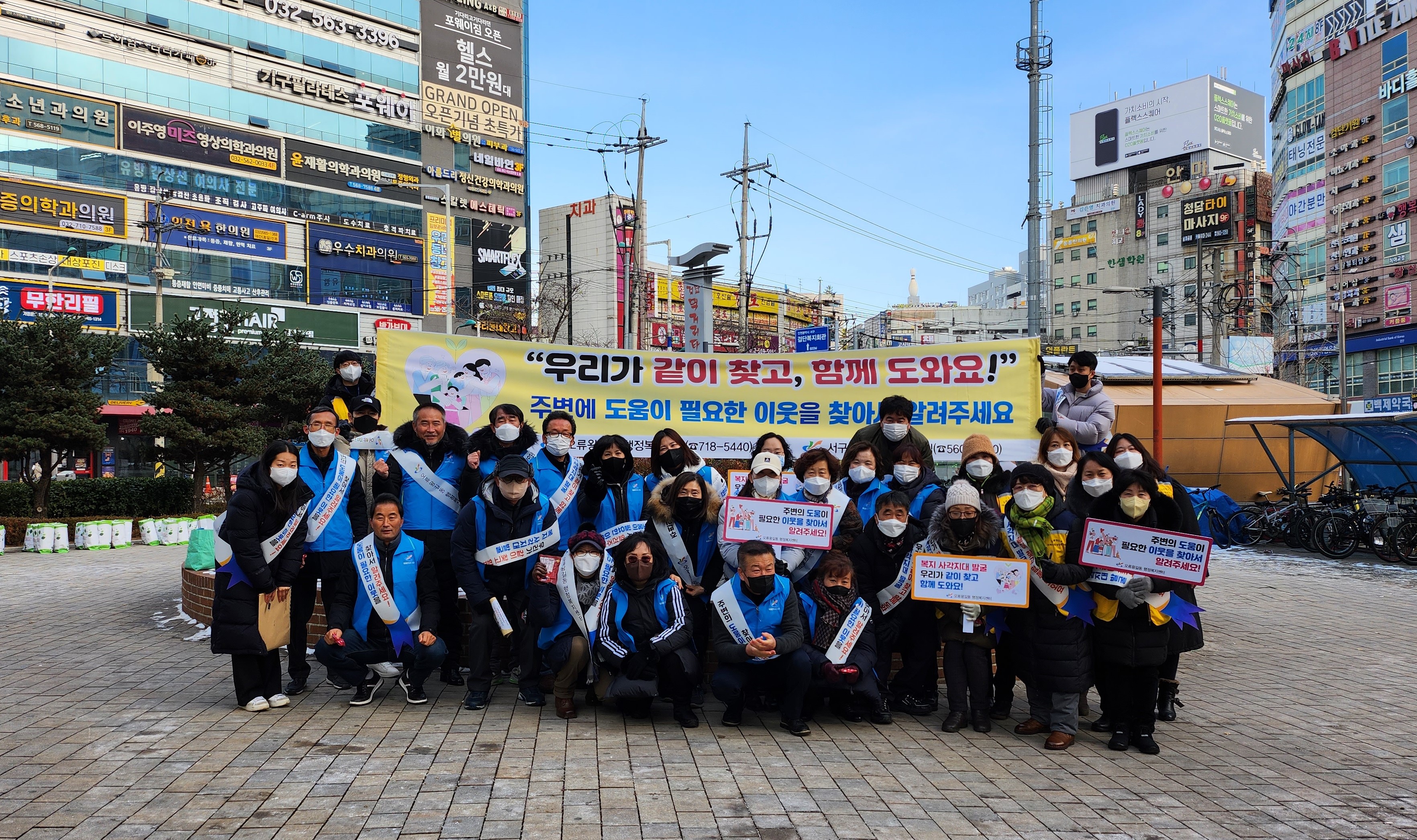 인천 서구 오류왕길동 지역사회보장협의체(위원장 양숙자)와 통장자율회(회장 한효국)는 지난해 12월20일 검단사거리역과 검단먹거리타운 일대에서 연말연시 복지사각지대에 놓인 소외된 이웃들에 대한 관심을 유도하여 지역사회에 나눔 및 돌봄문화를 조성하기 위한 『 복지 사각지대 발굴 캠페인』을 실시하였다.