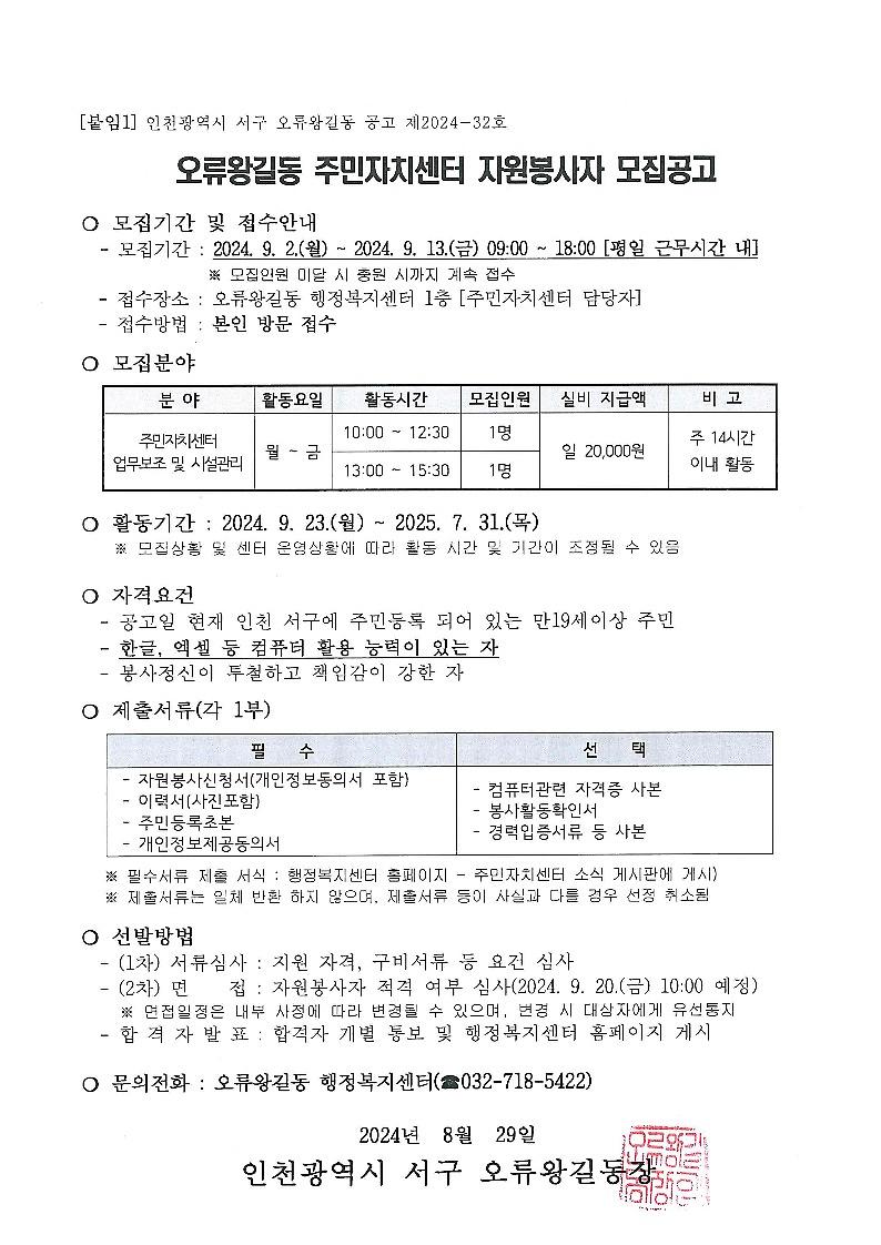 1. 공고내용 : 오류왕길동 주민자치센터 자원봉사자 모집