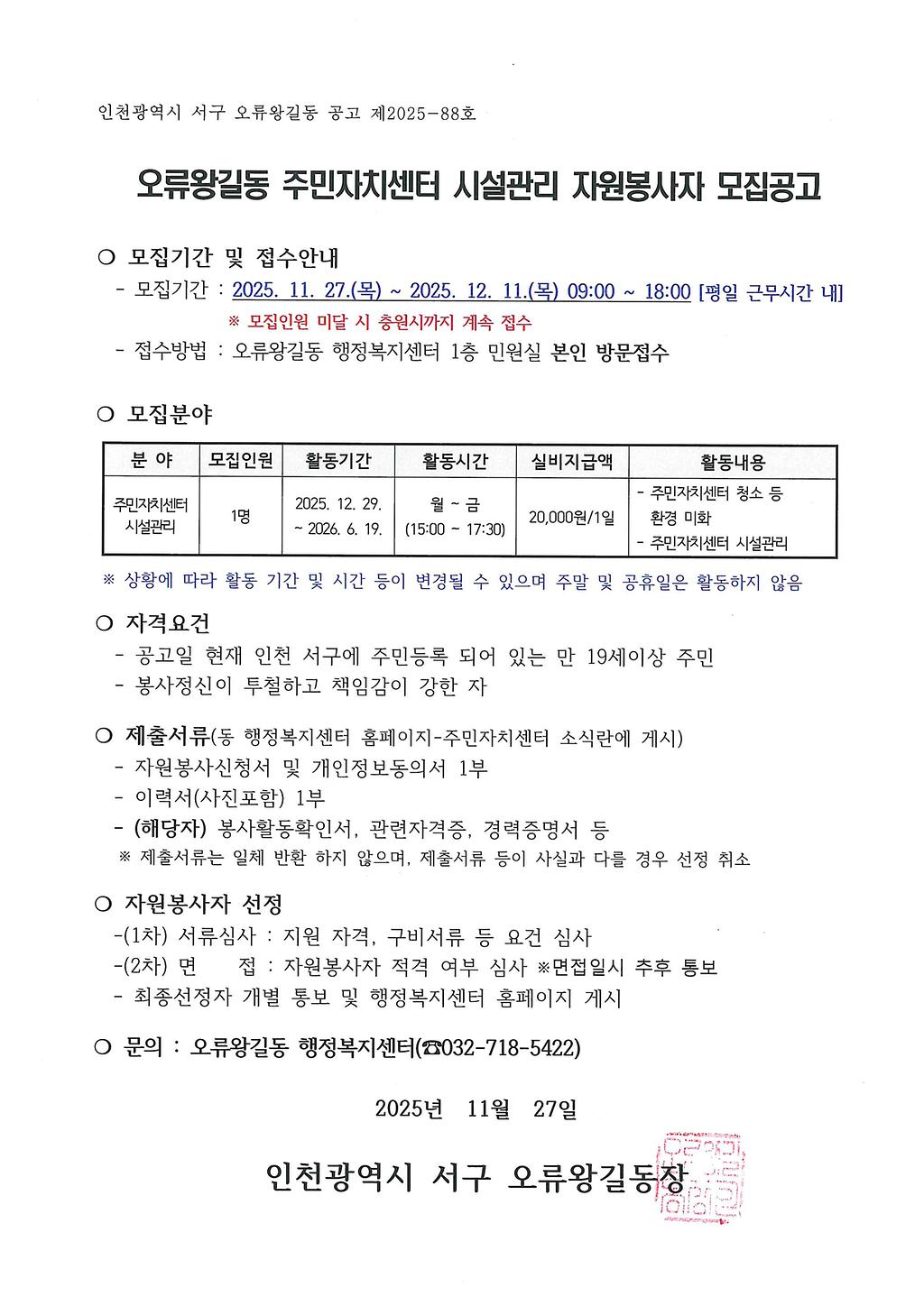 오류왕길동 주민자치센터 시설관리 자원봉사자 모집공고