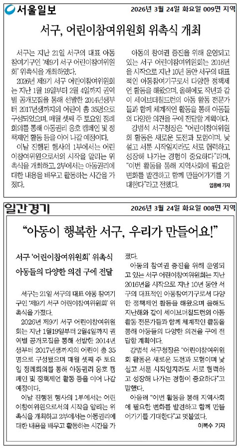 2026년 제9기 서구 어린이참여위원회 위촉식 개최 보도자료를 공유합니다.