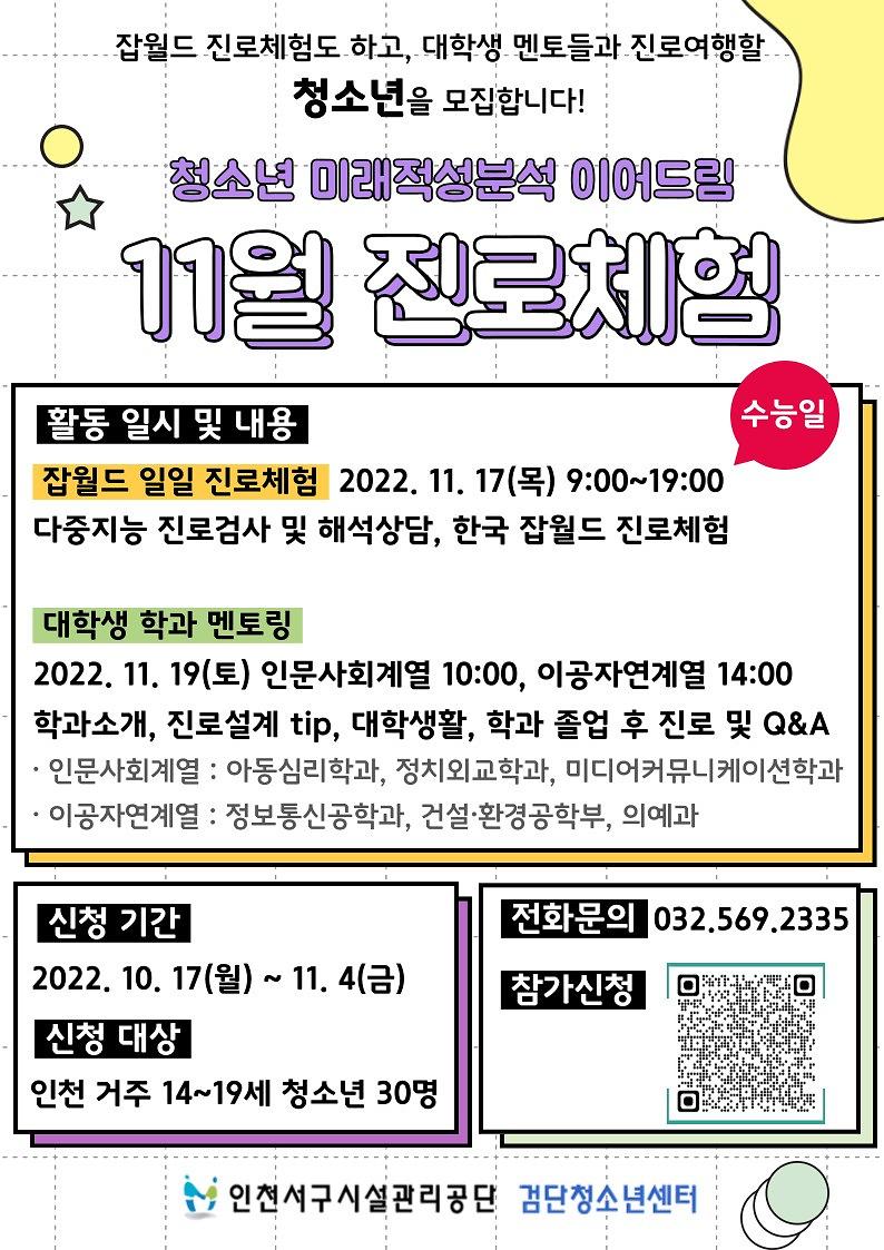 - 대학생 학과 멘토링: 2022.11.19.(토) 10:00~17:00 / 검단청소년센터