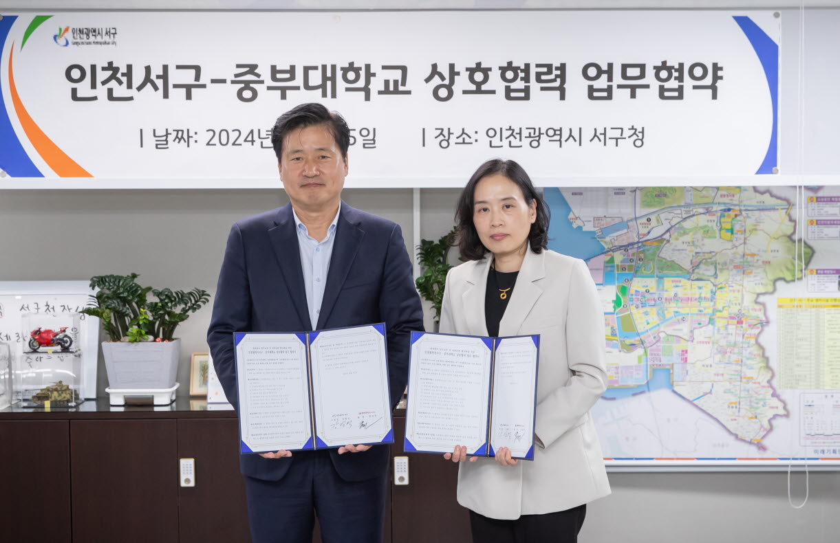인천 서구(구청장 강범석)는 중부대학교 원격대학원(원장 권성연)과 지난 15일「인천서구-중부대학교 상호협력 업무협약」을 체결했다.