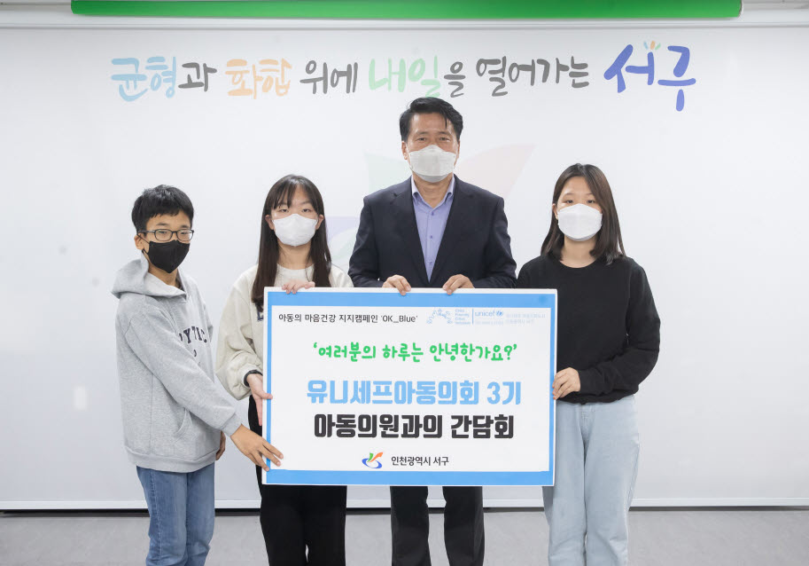 인천 서구(구청장 강범석)는 지난 17일 유니세프 아동의회 3기 행사로 서구를 대표하는 아동의원 3명과 함께 아동의 마음 건강 지지를 위한 간담회를 개최했다.