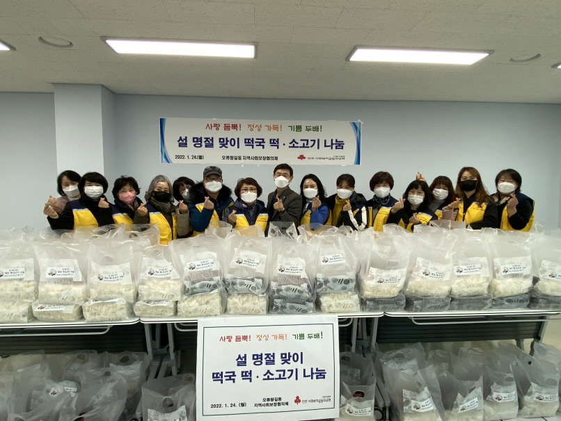 인천 서구 오류왕길동 지역사회보장협의체(동장 오염상, 민간위원장 양숙자)가 24일 설을 맞아 떡국 떡과 소고기를 마련해 지역 내 독거노인과 저소득가정 등 100세대에 전달했다고 밝혔다.