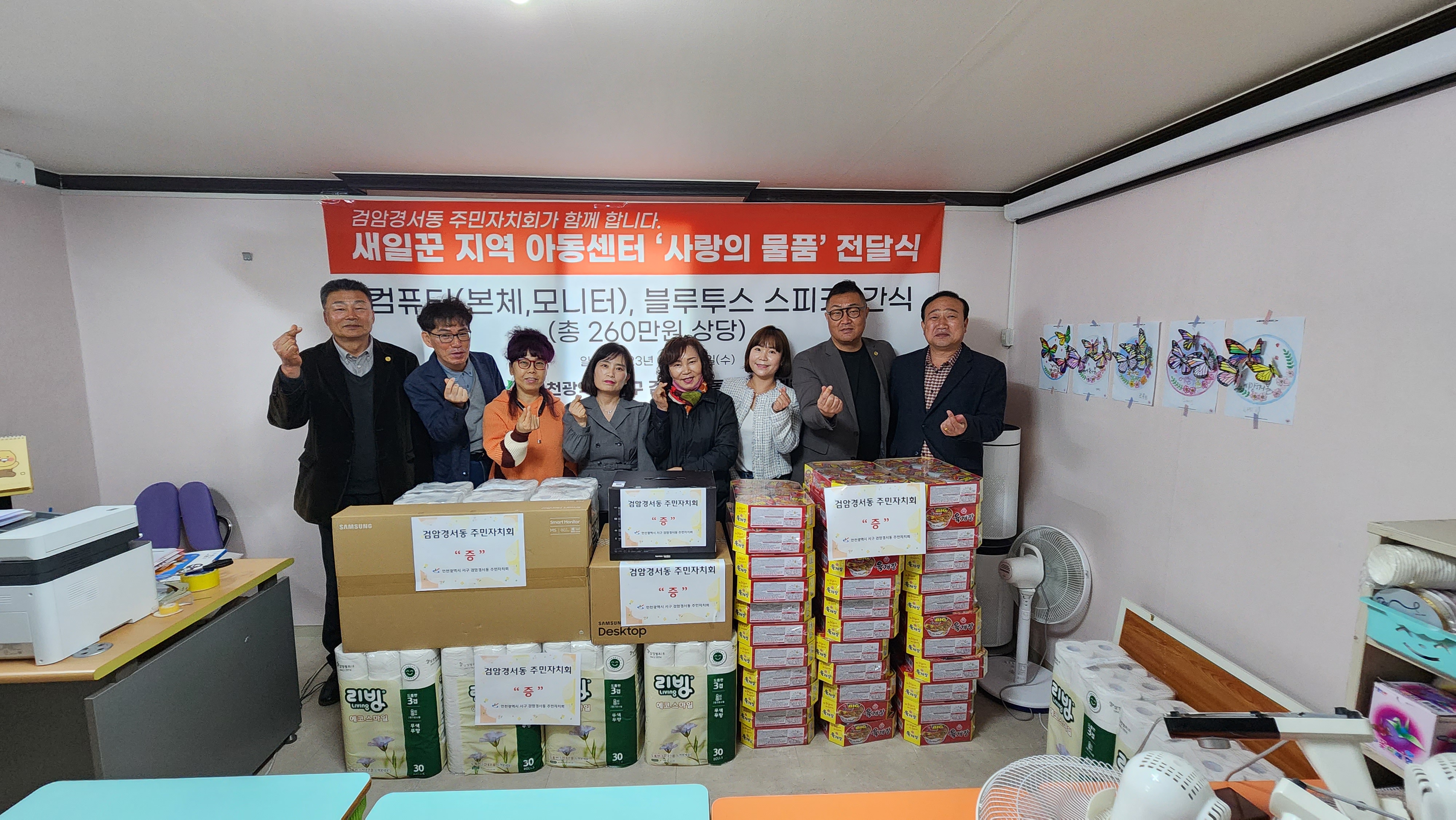 인천 서구 검암경서동 주민자치회(회장 최정훈)가 15일 자치회 임원진과 서구의회 김학엽 의원과 함께 새일꾼지역아동센터(센터장 박보은)에 컴퓨터, 간식 등 260만 원 상당 물품을 전달했다고 밝혔다.