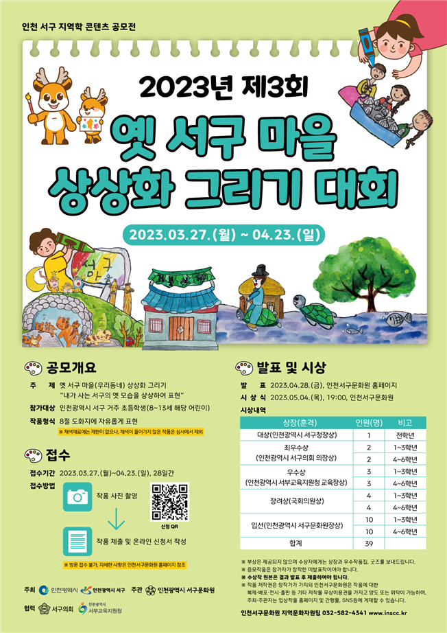 인천 서구문화원(원장 정군섭)이 ‘제3회 서구 지역학 콘텐츠 미술 공모전’을 개최하고 27일부터 4월 23일까지 참가 작품을 받는다고 밝혔다.
