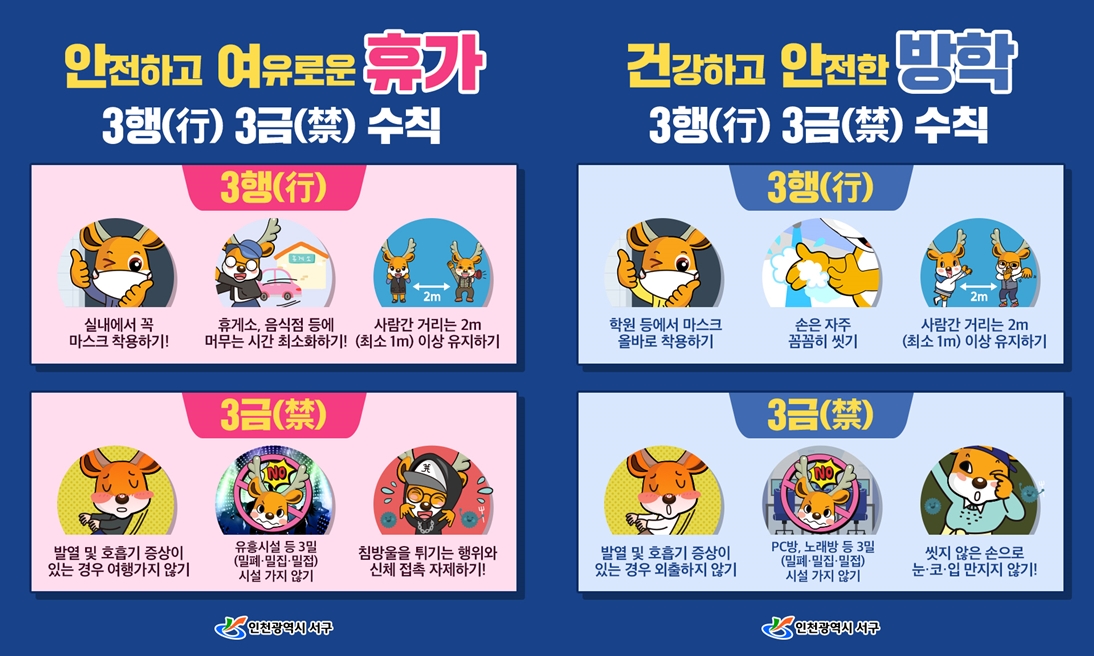 이에 따라, 서구는 ‘안전한 휴가’와 ‘안전한 방학’을 지내기 위한 방역수칙을 ‘꼭 지켜야 할 3가지, 꼭 피해야 할 3가지(3行·3禁)’로 나눠 적극 홍보하고 있다.