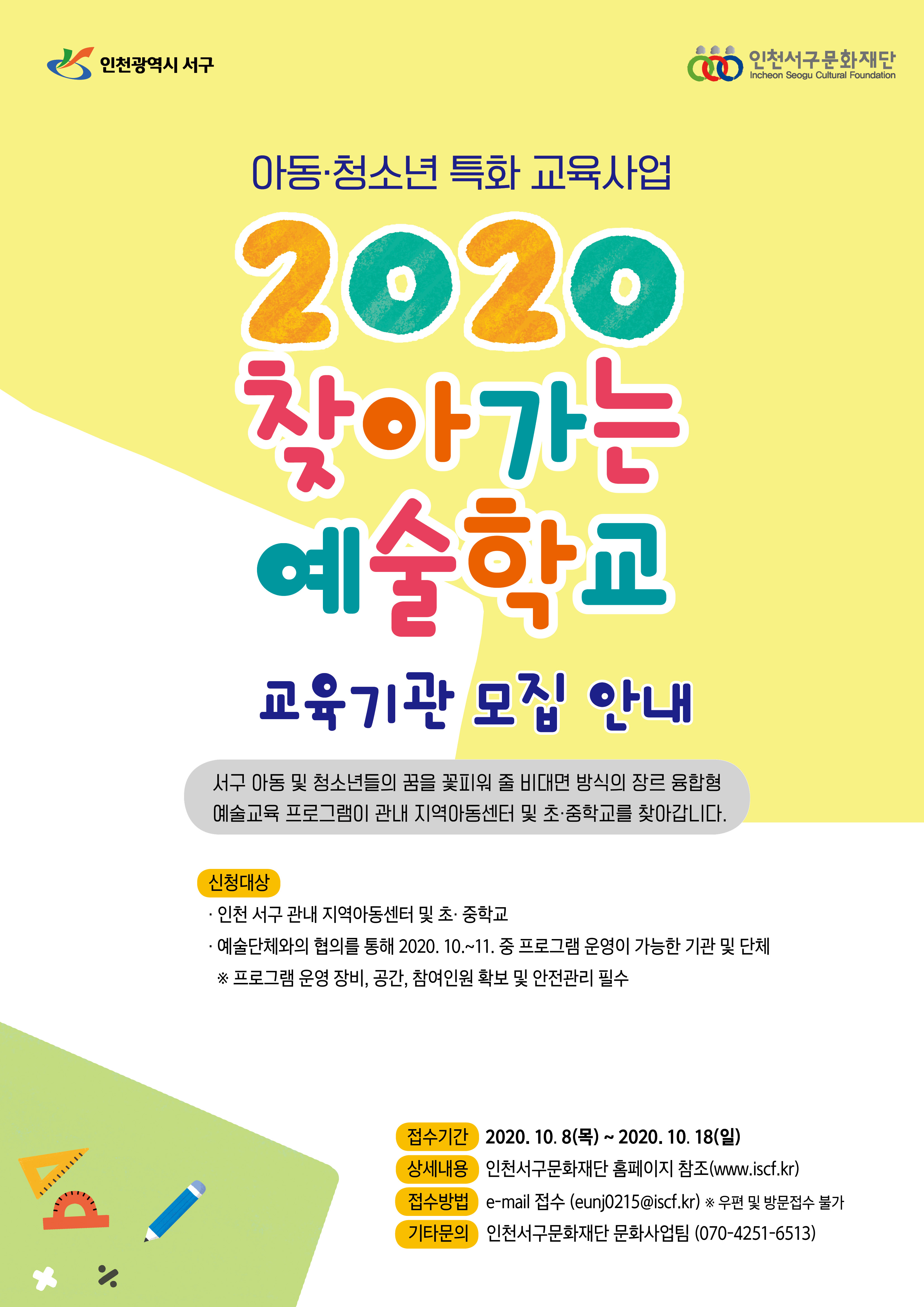인천서구문화재단(이사장 이재현)은 오는 10월 18일(일)까지 아동·청소년 특화 교육사업 ‘찾아가는 예술학교’에 참여할 교육기관 및 단체를 모집한다.