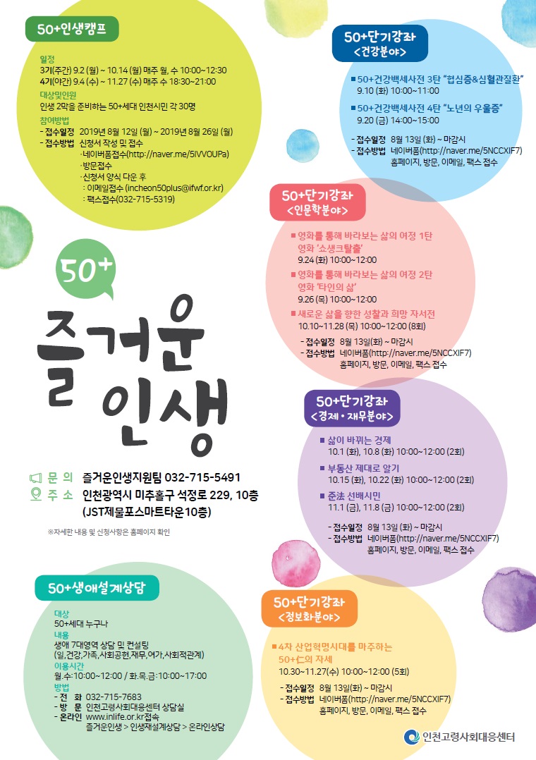 인천고령사회대응센터에서는 인천시 예비노인 세대들이 삶의 전환점에서 미래비전을 모색하고 새로운 관계망을 형성하여 안정적인 노후를 맞이할 수 있도록 지원하고자 2019년 하반기 50+인생캠프를 진행하고자 하오니 관심있는 분들의 많은 참여 바랍니다.